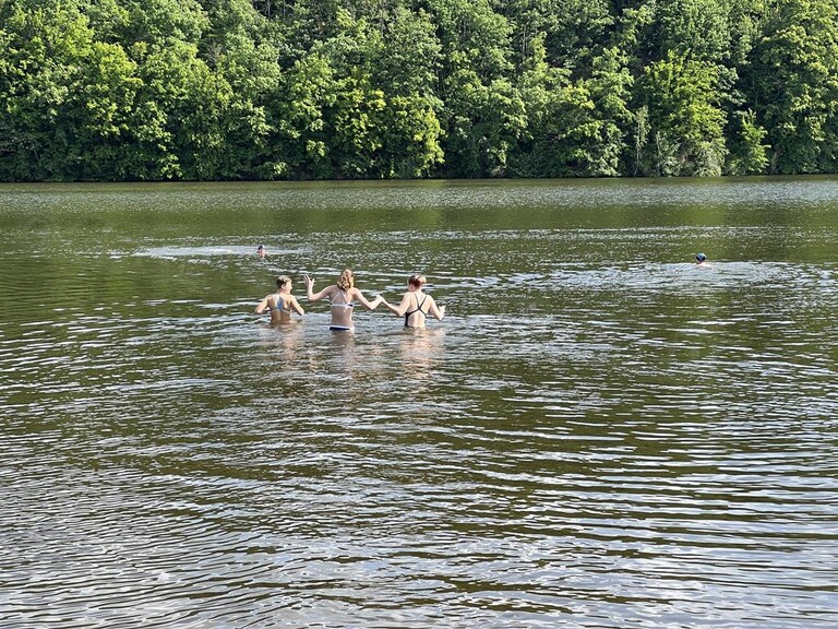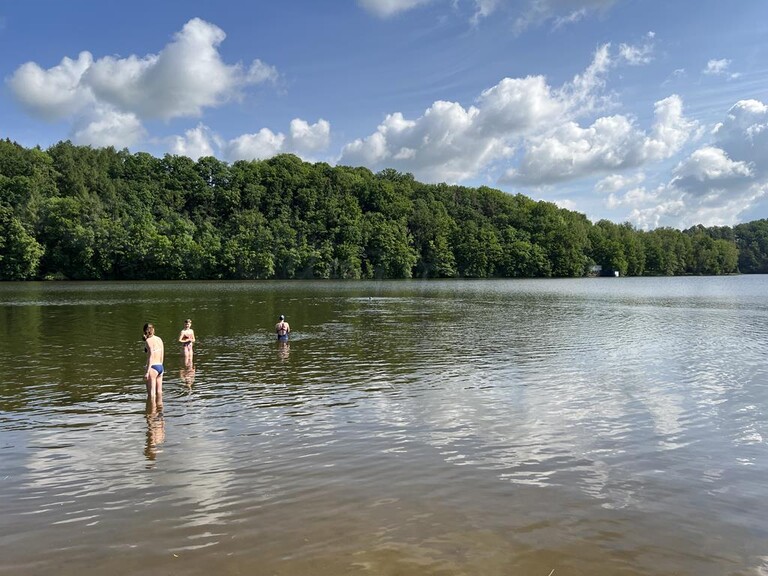 Am Freitag, den 20.05.22 bezogen wir mit 19 Schwimmern 7 Bungalows in der JH Falkenhain an der Talsperre Kriebstein. Das Wetter war schwühl heiß und so saßen wir, so bewegungsarm wie möglich, vor unseren Hütten, quatschten und hießen alle Ankommenden Willkommen. 18.30 Uhr waren alle da und wir gingen zum Abendessen (Nudeln mit Gulasch und Salate). Den restlichen Abend verbrachten wir mit Tischtennis, Karten spielen, in Gespräche vertieft oder mit Lernen unter der überdachten Terrasse, denn das Gewitter war inzwischen über uns hereingebrochen und es regnete, blitzte und stürmte.