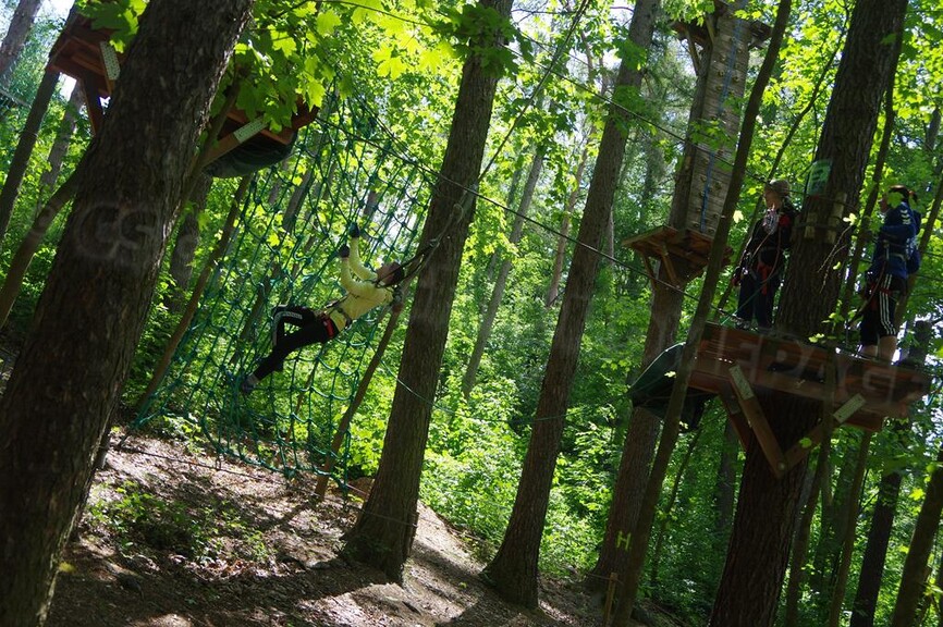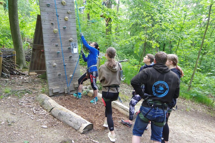 Am Samstag trafen sich einige 07.00 Uhr zum Frühsport: 5 km locker laufen entlang der Talsperre und anschließend noch 5 Runden Mini-Workout auf der Wiese der JH. Nach dem Duschen gab es pünktlich 08.00 Uhr ein reichliches Frühstück. Danach wanderten wir an der Talsperre entlang bis Erlebach, um 10.05 Uhr mit der Fähre nach Kriebstein überzusetzen. Dort stand für alle von 10.30 - 13.00 Uhr Klettern im Kletterwald auf dem Programm. Das Wetter war dafür ideal. Nach einer kurzen Einweisung und dem obligatorischen Probeklettern gab es 6 Parcours zur Auswahl: durch unterschiedliche Höhen und unterschiedliche Schweregrade der einzelnen Kletterelemente war für jeden die passende Herausforderung dabei. Nachdem wir alle Klettergurte wieder abgelegt hatten, holten wir uns am Kiosk noch Pommes oder Roster und fuhren 14.00 Uhr wieder mit der Fähre zurück nach Erlebach und liefen wieder zurück zur Herberge. Nachmittags wollten wir eigentlich noch eine Runde baden bzw. einmal bis zum anderes Ufer schwimmen. Leider hatte das Gewitter vom Vorabend nicht nur die Temperaturen deutlich abgekühlt, es ging auch ziemlich starker Wind. So trauten wir uns nicht ins Wasser, sondern spielten Volleyball oder faulenzten. Zum Abendbrot grillten wir Steaks, Roster und Käse. Auch an diesem zweiten Abend saßen wir wieder gemütlich auf der großen überdachten Terrasse zusammen.