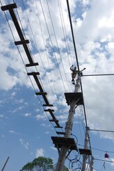 Der Samstag begann für Einige mit Frühsport (Joggen und Treppentraining) schon 06.15 Uhr. Spätestens zu Frühstück 8.00 Uhr waren schließlich alle wach. Anschließend machten wir uns auf den Weg zum Markkleeberger See. Dort hatten wir ab 10 Uhr Klettern im Kletterpark bestellt. Bei schwülen 28 °C und nach einer ausführlichen Einweisung, kletterten wir etwa 3 Stunden und 3 verschiedenen Höhen: jeder nach seinen Möglichkeiten. Für manche war es eine echte Herausforderung oder der Kampf gegen die Höhenangst, für manche einfach „Spaß in luftiger Höhe“. Am Ende schafften die Meisten den „Base-jump“, den Sprung von der 11m hohen Plattform in die Tiefe. Danach hatten wir uns unsere Abkühlung verdient. Wir verbrachten den Rest des Nachmittags am See mit chillen und schwimmen. Außerdem hatten wir super viel Spaß mit den 3 Stand-up-Paddle-Boards, die wir mitgebracht hatten. Erst, als die Gewitterwolken am Himmel immer schwärzer wurden, packten wir ein und fuhren in unser Schloss zurück. Abends zum Grillen auf der Terrasse hatte sich der Regen schon wieder verzogen und wir genossen den herrlichen Abend.