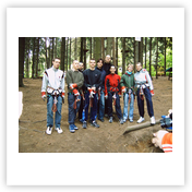 Für die ganz Harten begann der Freitag mit Frühsport ab 7.00 Uhr. Wir gingen 30min am Ufer der Talsperre entlang joggen. 8.00 Uhr gab’s Frühstück und dann ging es los Richtung Talsperre Pöhl zum Klettern im Hochseilgarten. Nachdem wir unsere Kletterhosen + Handschuhe angezogen und eine kurze Einweisung erhalten hatten, konnte sich jeder selbst in den unterschiedlichen Parcouren „Fitness“, „Abenteuer“ und „Risiko“ ausprobieren. Und Mancher, der bis dahin dachte, er habe Höhenangst, lernt plötzlich bei „Tarzansprung“, „Seilbahn“, „Skateboard“, u.s.w. ganz neue Seiten an sich kennen. Den Muskelkater in Unterarmen und Bauch spürten wir auf alle Fälle am nächsten Tag. Als wir im Kletterwald waren, schien die Sonne und so starteten wir optimistisch Richtung Pirk. Zunächst wurde im Globus eingekauft und Mittag gegessen. Doch als wir wieder herauskamen, hatte sich der Himmel schon wieder zugezogen. So verbrachten wir den restl. Nachmittag mit Schlafen, Tischtennis, Skat und Quatschen. Pünktlich 18.00 Uhr ging es zum Abendbrot (Makkaronie mit Bolognese), denn von 19.00 – 21.00 Uhr hatten wir 2 Bahnen Bowling in Taltitz bestellt.
